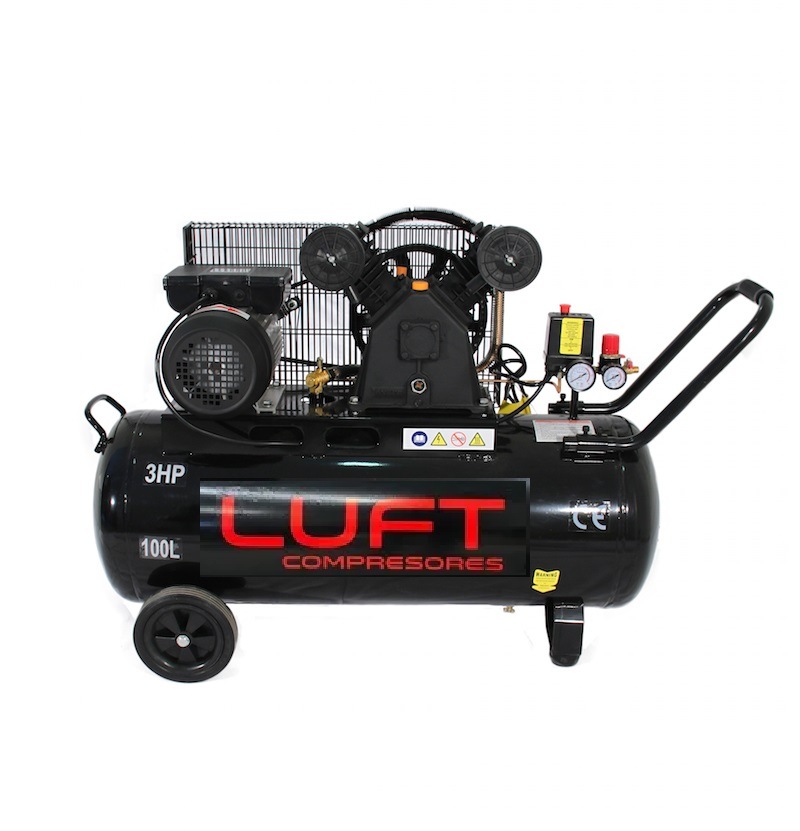 Este compresor cuenta con un motor de 3 HP y una capacidad de estanque de 100 litros, permitiendo un flujo constante de 240 litros por minuto. Su transmisión por correa asegura un funcionamiento suave y duradero, mientras que su cabezal en «V» optimiza el rendimiento y reduce el desgaste mecánico. Además, su diseño compacto facilita el transporte y almacenamiento.