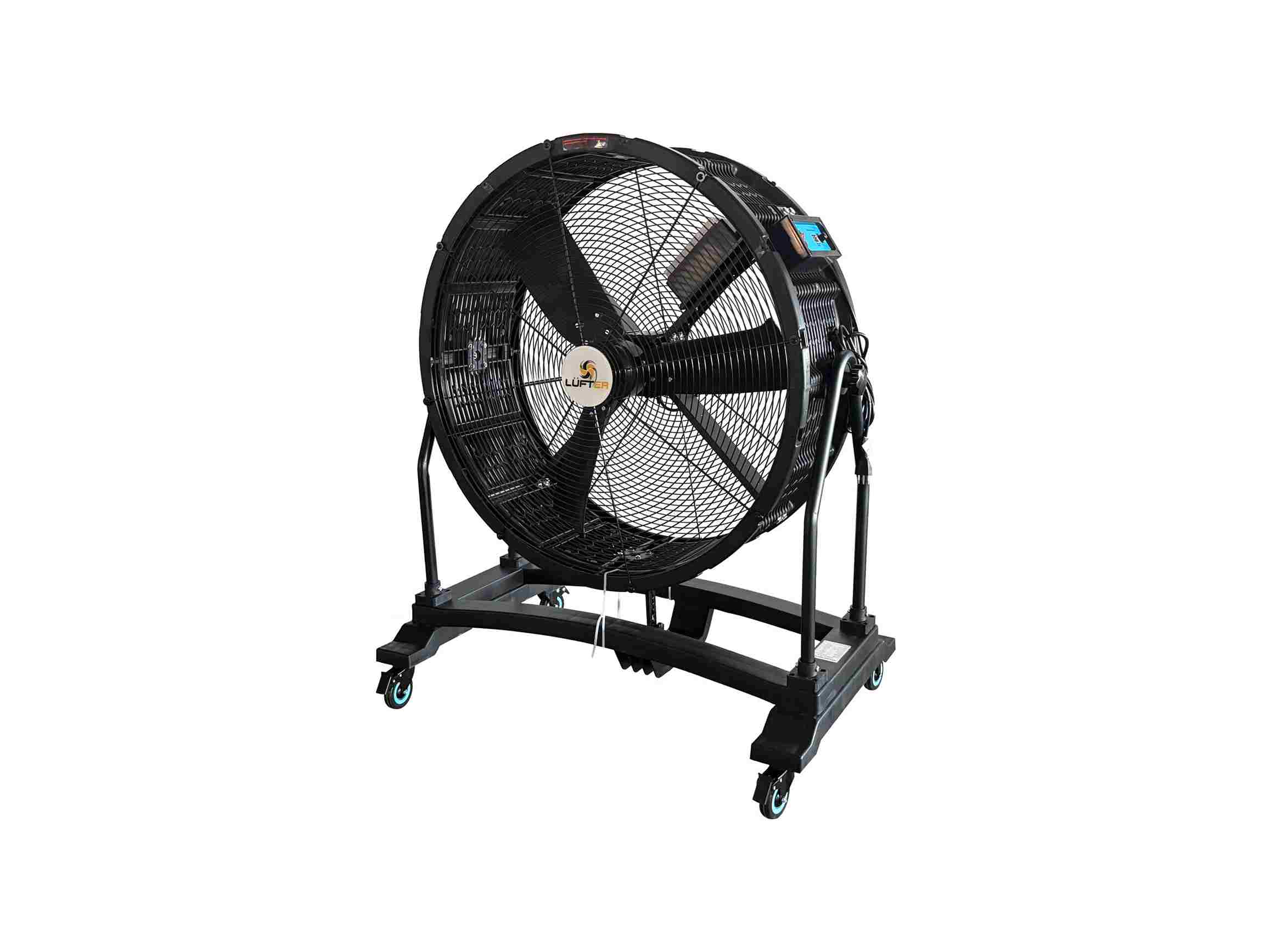 Este equipo incorpora aspas de gran tamaño especialmente diseñadas para mover grandes volúmenes de aire de manera eficiente y uniforme. La rejilla protectora metálica frontal y trasera garantiza operación segura en entornos con personal trabajando, cumpliendo con estándares de seguridad industrial. El panel de control digital ubicado en la parte superior permite ajustar fácilmente la velocidad y configurar el funcionamiento según las necesidades específicas de cada espacio.