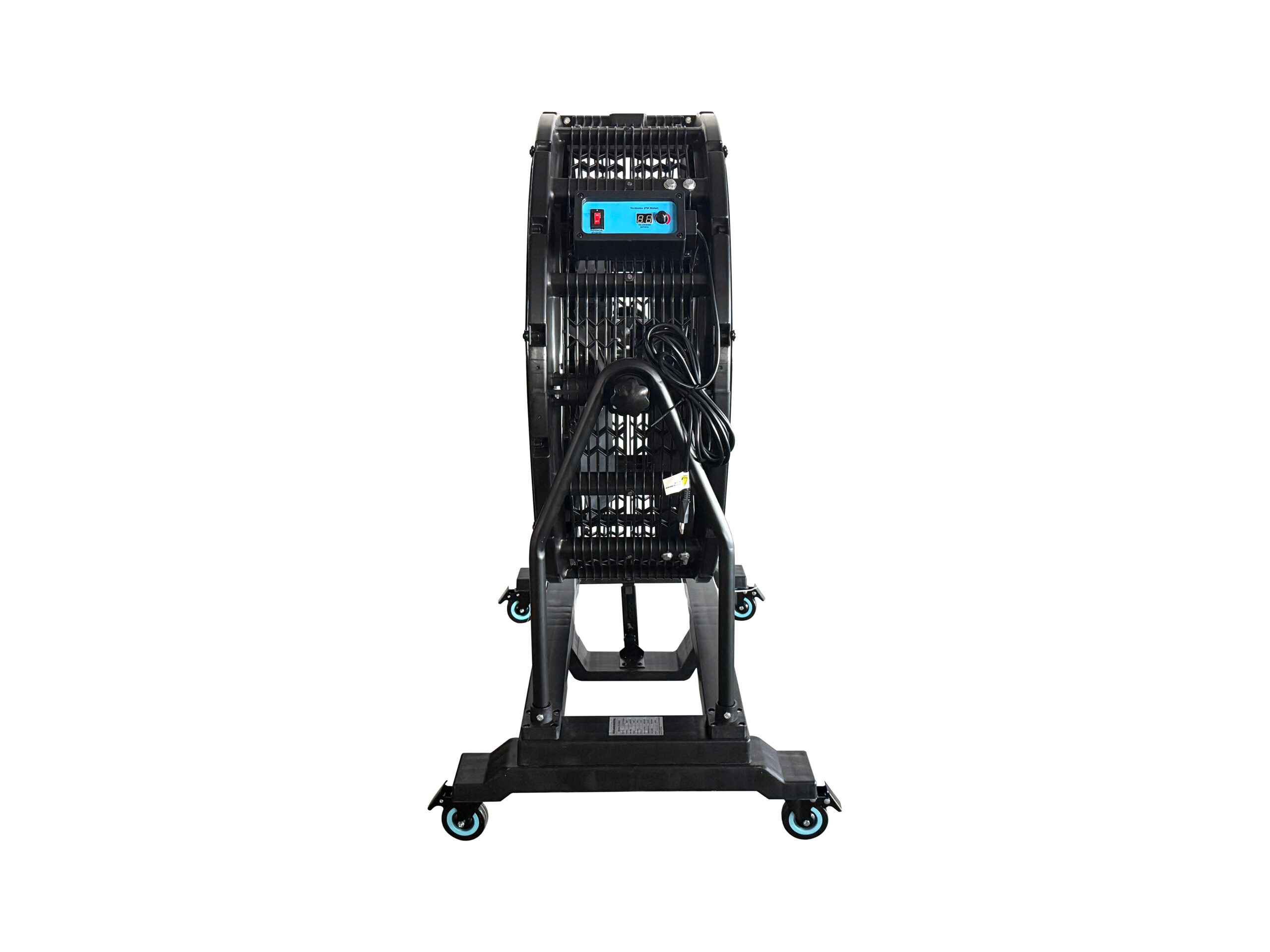 El sistema de movilidad del ventilador incluye cuatro ruedas industriales giratorias de alta resistencia equipadas con frenos de seguridad, permitiendo trasladar el equipo entre diferentes áreas de trabajo según sea necesario. Las manijas laterales ergonómicas facilitan el manejo y posicionamiento del ventilador, mientras que su base ancha proporciona estabilidad excepcional incluso operando a máxima potencia con sus 900 RPM.